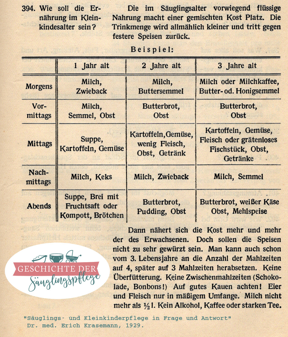 Die folgenden Beikostempfehlungen stammen aus dem Buch "Säuglings- und Kleinkinderpflege in Frage und Antwort - Eine Vorbereitung zur Prüfung als staatlich anerkannte Säuglings- und Kleinkinderpflegerin" von Dr. med. Erich Krasemann, Kinderarzt in Rostock, 10.-13. verbesserte Auflage, Georg Thieme Verlag, Leipzig, 1929.