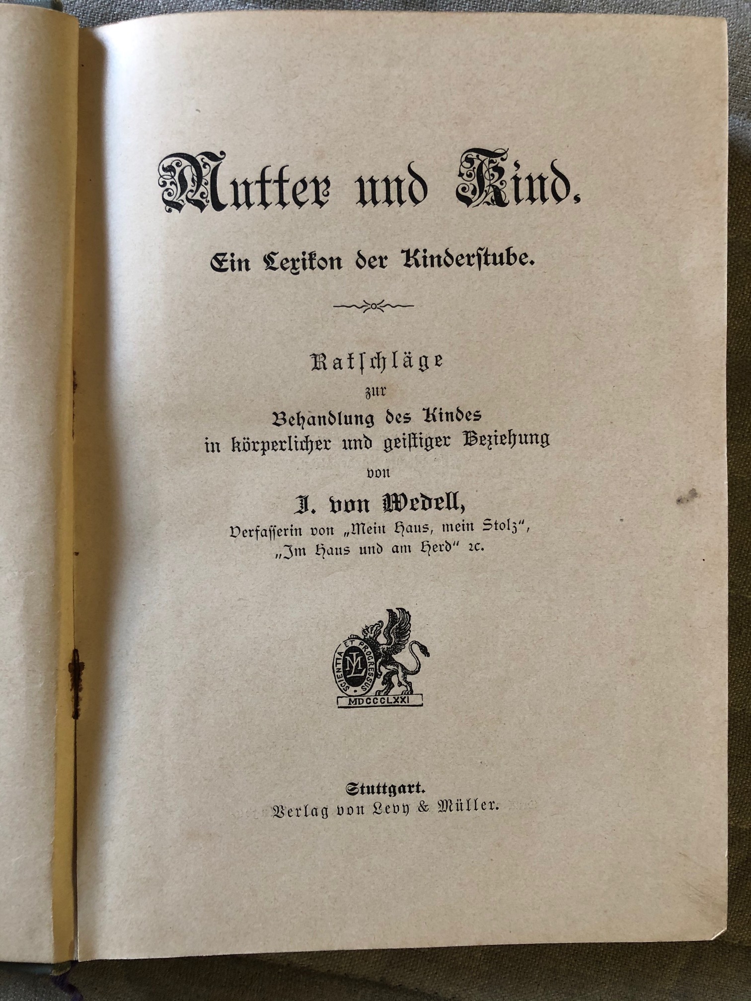 Eines der ersten Bücher, die ich meiner Sammlung historischer Ratgeber hinzufügte, war "Mutter und Kind. Ein Lexikon der Kinderstube". Geschrieben wurde es von J. von Wedell, die auf dem Titelblatt als Verfasserin weiterer Werke wie "Mein Haus, mein Stolz" und "Im Haus und am Herd" angepriesen wird. Das einzige Datum im Buch ist eine lateinische Zahl auf derselben Seite; sie bedeutet 1871. Laut Antiquariat war das Buch jedoch 1898 erschienen und hinter dem Pseudonym verbarg sich eine Helene Freifrau von Schroetter.