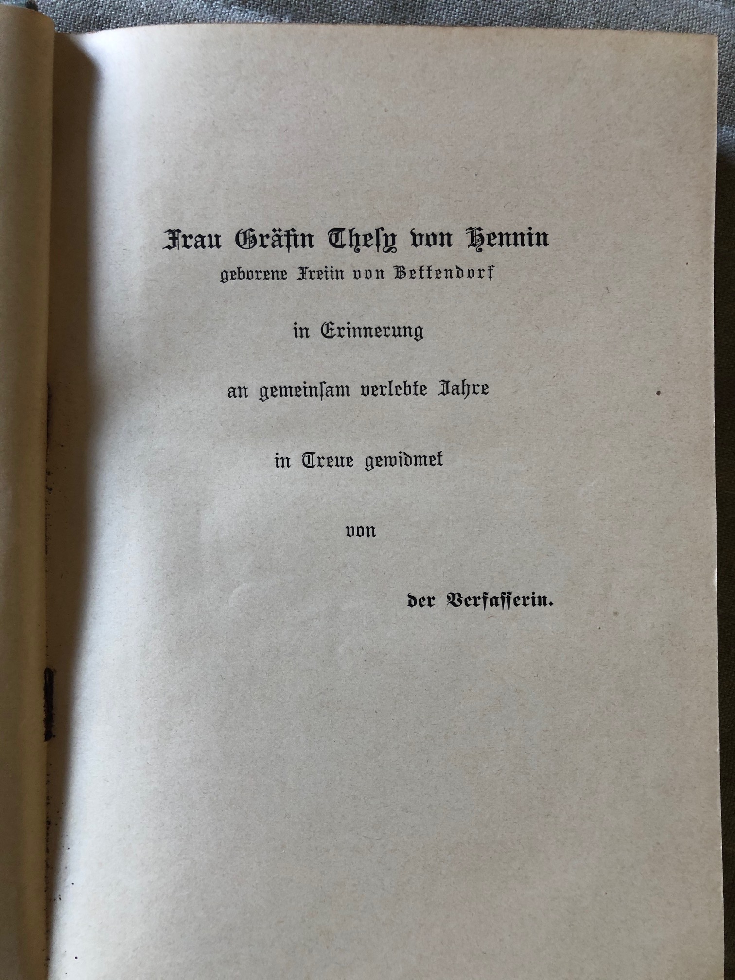 J. von Wedell widmete das Buch einer "Frau Gräfin Thesy von Hennin, geborene Freiin von Bettendorf, in Erinnerung an gemeinsam verlebte Jahre". Es handelt sich dabei mit allergrößter Wahrscheinlichkeit um Maria Theresia Maximiliane Emma von Bettendorf, geboren am 3. Juli 1863 zu Bamberg, verlobt im Juni 1887 mit August Grafen von Hennin, Premierleutnant im 1. badischen Leib-Grenadierregiment Nr. 109. Tochter von Heinrich Wilhelm Ludwig Freiherr von Bettendorf (1828-1879) und Olga geb. Gräfin von Rheinstein und Tattenbach (*1859) [Quelle: Gothaisches genealogisches Taschenbuch]